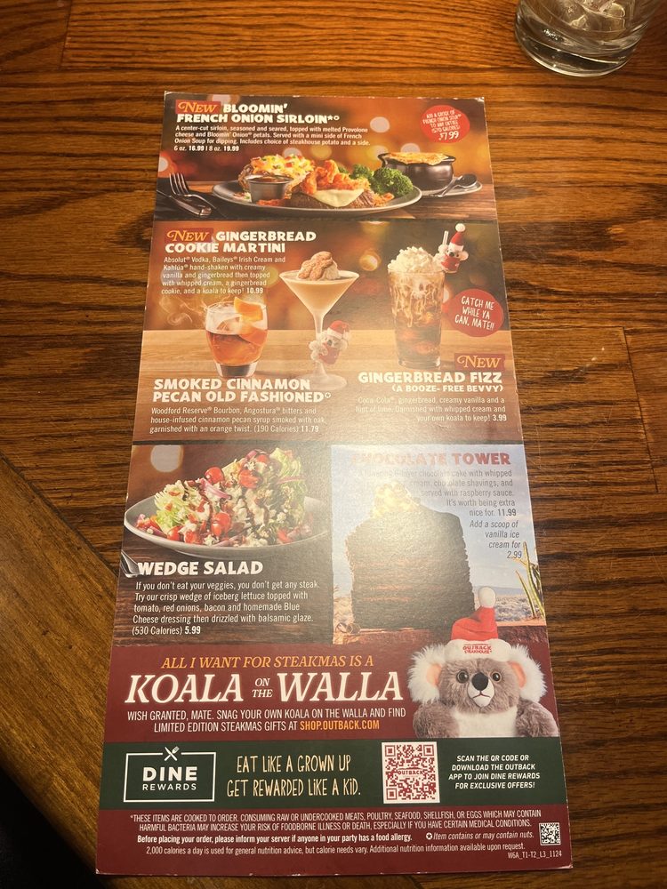 The highlights of the menu include delightful appetizers like the Kookaburra Wings and the famous Bloomin' Onion, both praised by guests for their bold flavors. For lunch, the Soup and Salad Combo is a must-try, featuring options like Baked Potato Soup or the House Side Salad, all available until 4 pm for just $9.99.